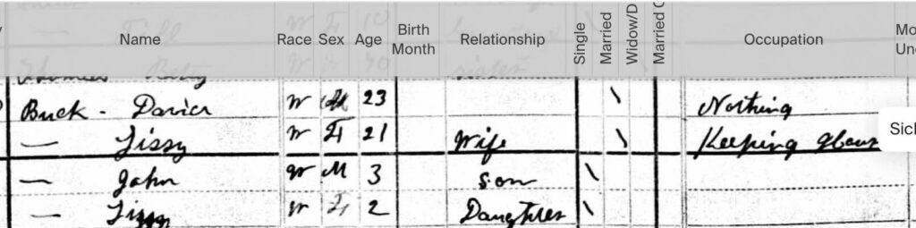 Mary Kate “Lissy” Bohanan was born July 15, 1878. She appears in the 1880 census at age two in her parents’ household. By about 1898, she had married and by 1910 was living in Fleming County with her husband and two children.